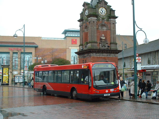 Bexleyheath Market Place. This bus still wears the Millennium Dome branding