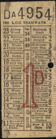 | London County Council, LCC Tramways geographic style tickets for services 36-38 & 40. Abbey Wood - Embankment (36-38) or Beresford Square - Savoy Street (40). The reverse of another ticket is also shown with all night services.. |