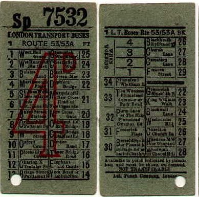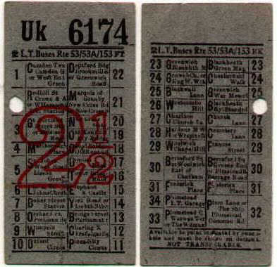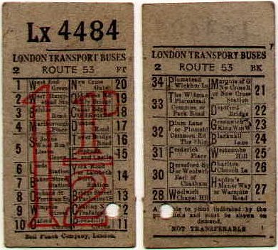 | Routes 53 and 53a from Plumstead, Wickham Lane to West End Green, Hampstead. They seem to show the route from Plumstead Common and then via Woolwich and Charlton lower road to New Cross rather than Charlton Village and Blackheath. The ticket below is for 53, 53a and 153. The destinations are from Camden Town to either Plumstead LT Garage or Plumstead Common Warwick Terrace, via either Greenwich and Woolwich or Blackheath, Charlton and Woolwich. |