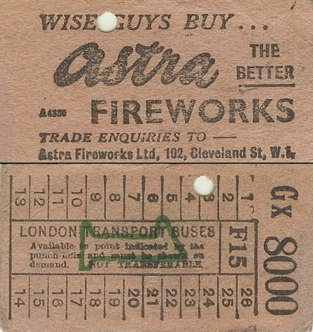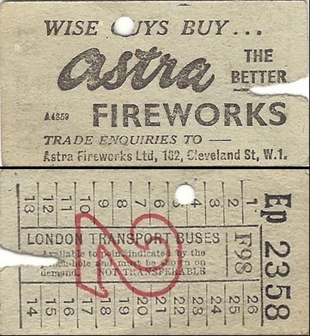 | These tickets are of the bell punch type, probably from the 1950s. They carry advertisements on the rear for Astra Fireworks. |
