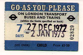 London Transport 'Go as you please' ticket, these were issued to tourists from overseas. This is a weekly child version from 1972.