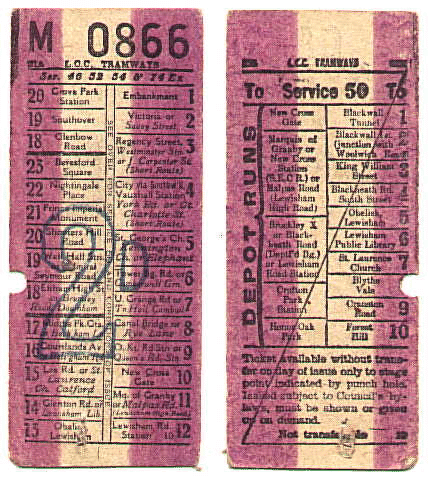 Services 46, 50 52, 54, & 74 ex. These services shared parts of the route with each other. On the back of the ticket can be some of the fare stages used on depot runs. The trams were in service when travelling 'off route' to the depots, through fares to destinations on the usual route could be paid for. 46..Beresford Square, Woolwich - City via Southwark. 52. Grove Park Station - City via Southwark. 54. Grove Park Station - Victoria Station. 74. Downham, Bromley Road - Blackfriars Ticket from Steve Thoroughgood. |