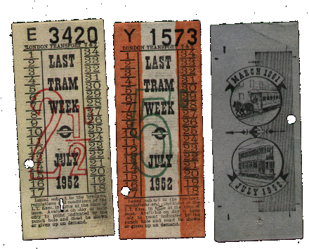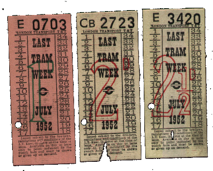 These were a little larger than normal tickets with the legend on the font, 'LAST TRAM WEEK JULY 1952'. On the reverse the dates of the first and last trams. The first ones being horse trams. The date on the reverse of the tickets refers to the fact that London's first tramways started on 23 March 1861, between Marble Arch and Notting Hill Gate. The lines were taken up shortly after as the rails projected from the roadway, and were a danger to other road users. Many believe it was a bad decision to get rid of the trams and replace them with motor buses. Today this point of view makes more sense than ever. Years and years of neglect however made it an expensive option to do all the work that was needed to repair the permanent way and rolling stock, so the easy option was taken. Trams are now beginning to make a comeback to London. Some cities of the World never got rid of them. The only place in the UK being Blackpool. For more about these visit the Horse Tram Page. |