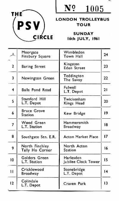 | A ticket for The PSV Circlcle London Trolleybus Tour on Sunday 16 July