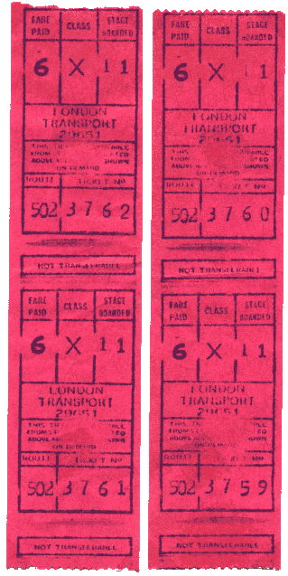| The tickets above date from around late 1970, they are ready for decimal the 'd' has been left off the price. The flat fare was 6d. London Transport were worried that after decimalisation (Feb 15 1971) there would be no coin to pay this fare with. A campaign was launched by newspapers of the day with the slogan 'Save our Sixpence'. This led to the retention of the sixpence as a two and a half pence coin. They needn't have worried by 1974 the fare had doubled to 5p, and by 1976 it had doubled again to 10p. Also within a few weeks of decimalisation most of the sixpenny coins were traveling in pairs as 5p. |