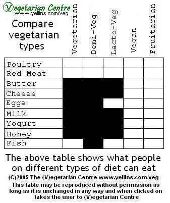 | Different types of vegetarian |  What you can eat depends on what type of Vegetarian you are.  The main types are listed below. Some people call themselves Veggie's if they eat fish, but this is not the case, as you can see below.  If Vegetarians do eat eggs, they usually use free-range eggs. Those that eat cheese will only eat Vegetarian Cheese, as some cheeses are made using rennet from a cow's stomach. More and more cheeses are using a Vegetarian alternative to this.  We have worked on a comparison table that you can use to help decide which type of vegetarian you are or desire to be. |  Octo-Lacto Vegetarian (The most popular definition, also known as Ovo-Lacto) Vegetarians eat no red meat, poultry, fish, or products that have ingredients which are animal-based such as Gelatine. They do eat Vegetarian cheese, yoghurt, milk, eggs, honey etc. They also don't wear leather or fur. |  Lacto Vegetarian Lactose-Vegetarians do not eat any foods that involve the slaughter of animals. They don't eat eggs, but do eat Vegetarian cheese, yoghurt, and milk. |  Vegan Vegans do not eat the same things as vegetarians but also will not eat any product that is derived from animals. No meat, cheese, butter, milk, eggs or honey. |  Demi-Vegetarian (commonly misinterpreted as Vegetarian by meat-eaters) Demi-Vegetarians don't eat red meat or poultry, but they do eat fish, eggs, Vegetarian cheese, and milk-based products. This is not true Vegetarianism, although it is probably easiest for those just starting to become Veggie. |  Fruitarian A Fruitarian is somebody who believes that you should not kill any living thing to survive. Instead, they can only eat the fruit of plants that don't actually mean death to the plant.  This is actually true believe it or not! |