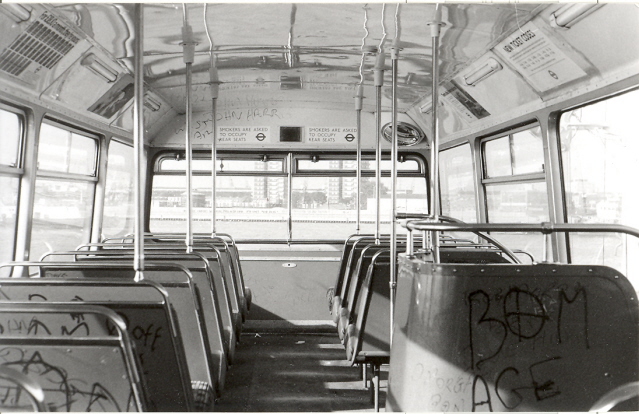 The top deck of another of the buses, complete with graffiti heading over the river. Perhaps to a new life overseas after a spell at Ensigns. |